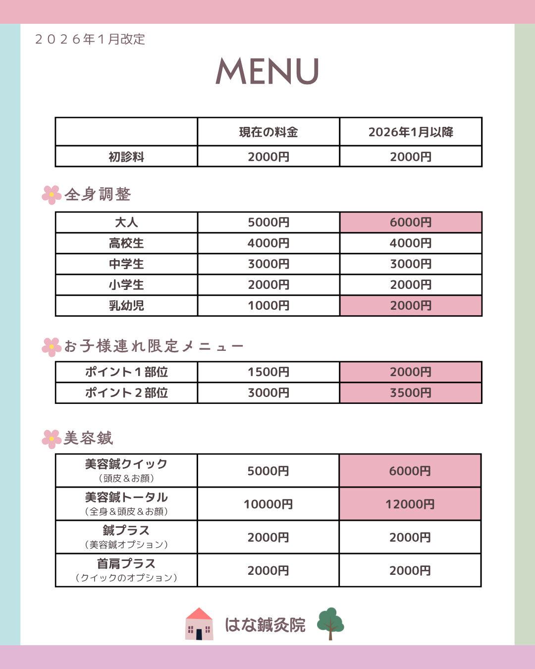 先日ご案内した通り、2026年から一部施術料金の値上げをいたします。